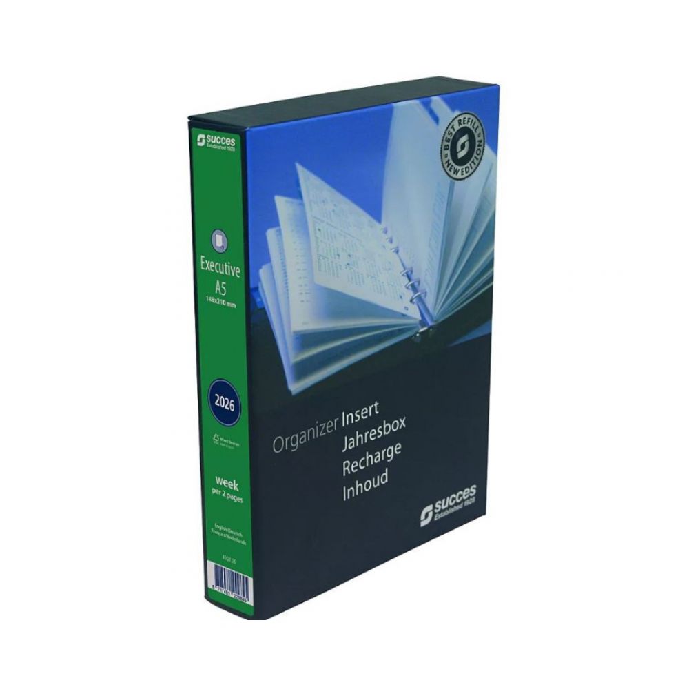 Succes biedt een breed scala aan agendavullingen voor hun populaire organizer-systemen. De agendavullingen voor 2026 van Succes zijn beschikbaar in verschillende formaten: Executive A5, Mini, Senior, Junior en Mini. De complete Succes inhoud zit in een stevige archiefbox, naast de kalender bevat deze box: een transparant beschermblad, personaliakaart, tabbladen, een verjaardagskalender, maandblaadjes, Things to Do, een alfabet, notitieblaadjes en diverse informatiebladen en landkaarten. Formaat: Executive A5. Indeling: één week op twee pagina’s. Afmetingen: 14.8 x 21 cm. Papier: wit, gelijnd. Taal: Engels, Duits, Spaans en Nederlands. Referentie: IEQ7.26
